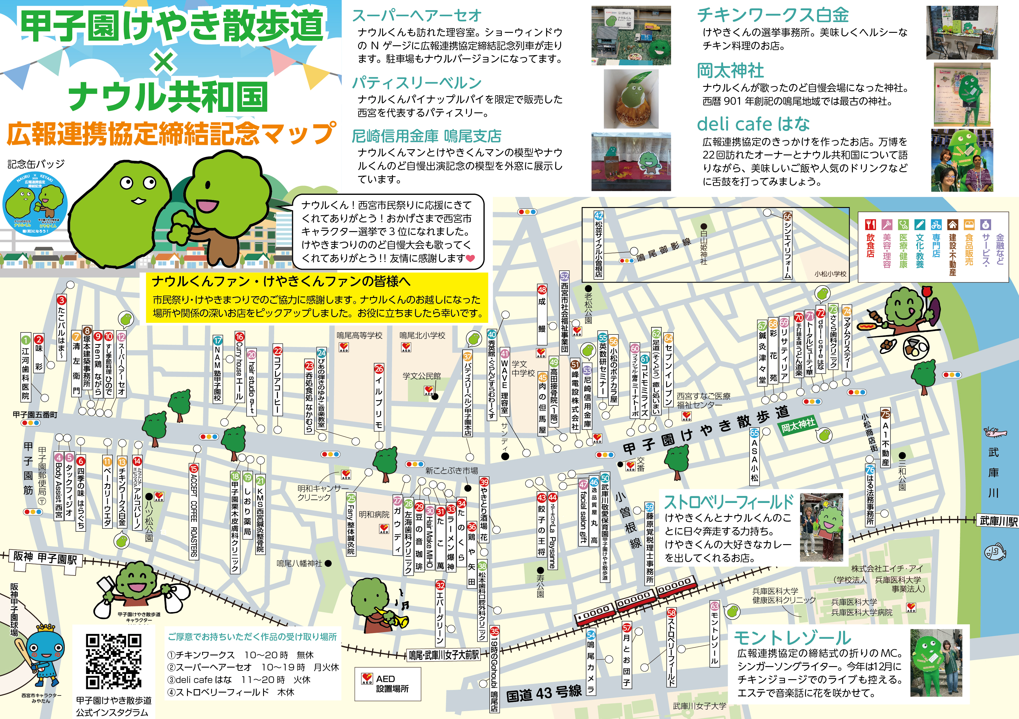 現在75店舗が加盟する甲子園けやき散歩道の全店を掲載したお散歩マップができました。こちらのPDFか各加盟店にはパンフレットも置いています。
